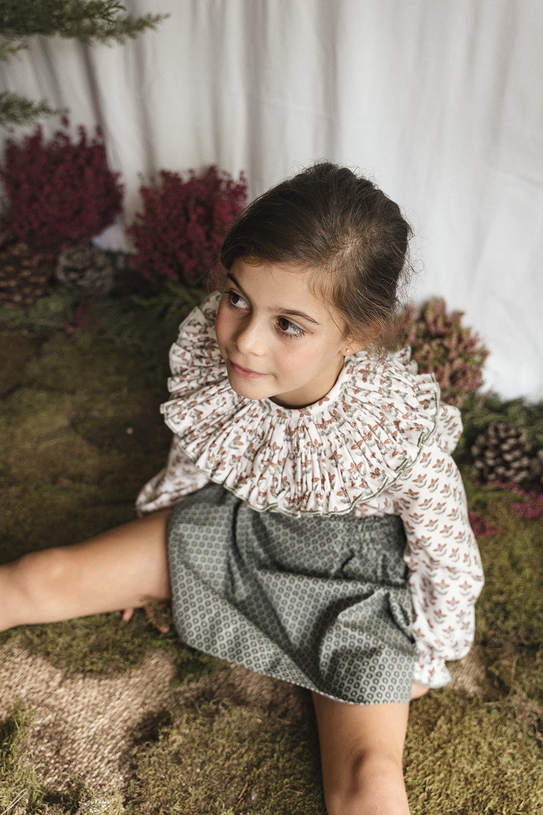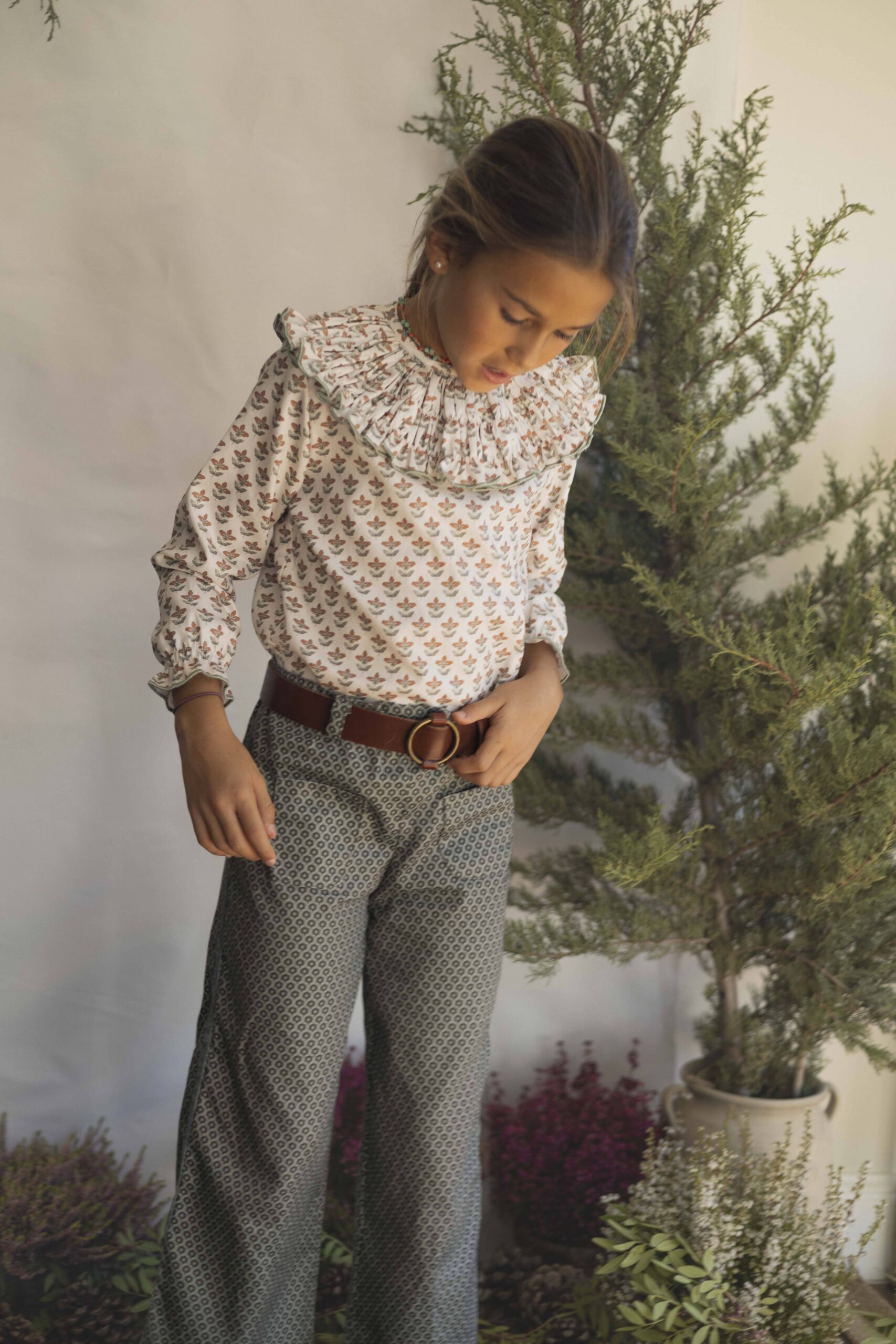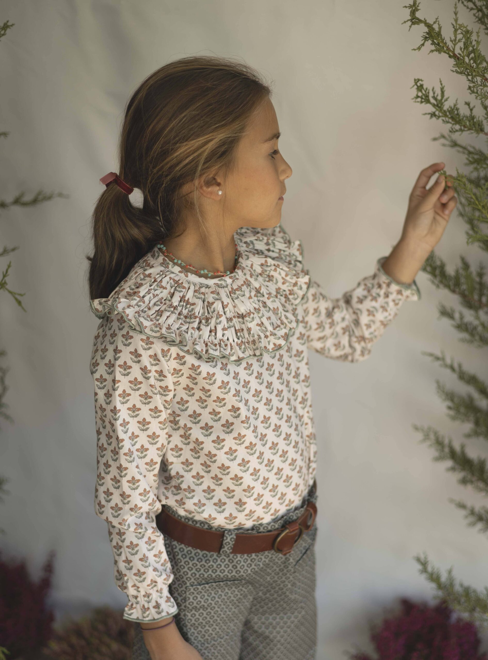 CAMISA CON CUELLO ENGOMADO, HECHA EN TEJIDO DE ALGODÓN ESTAMPADO EN TONOS TEJAS Y VERDES.