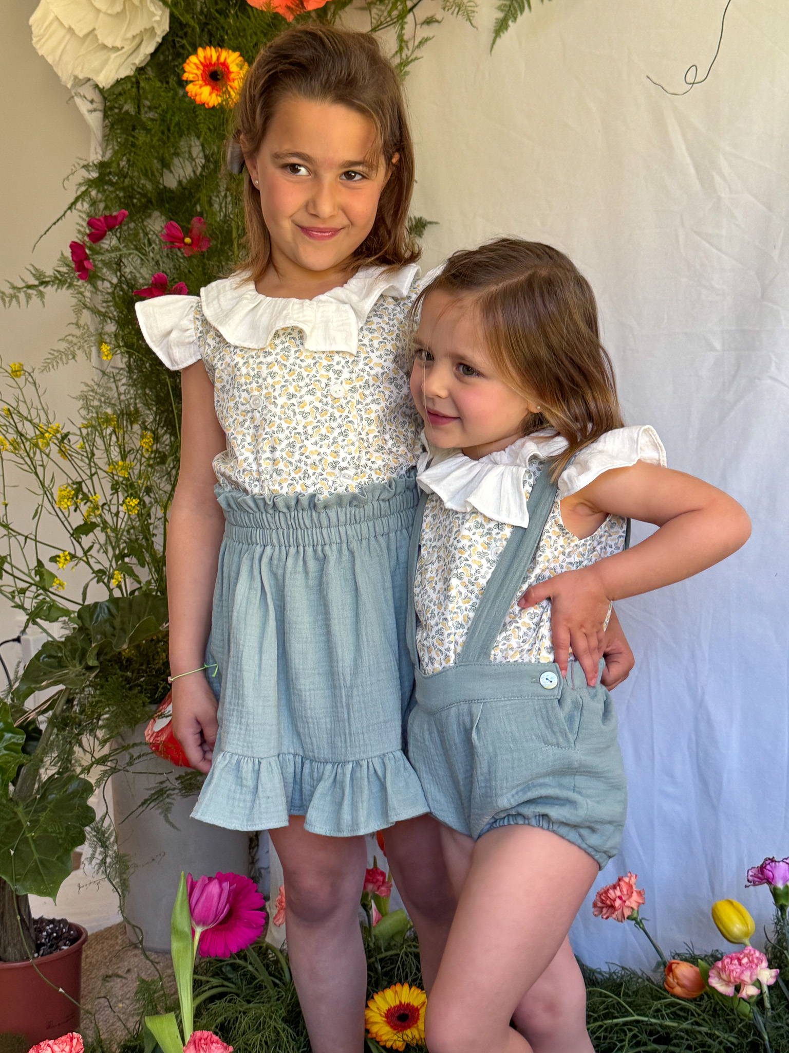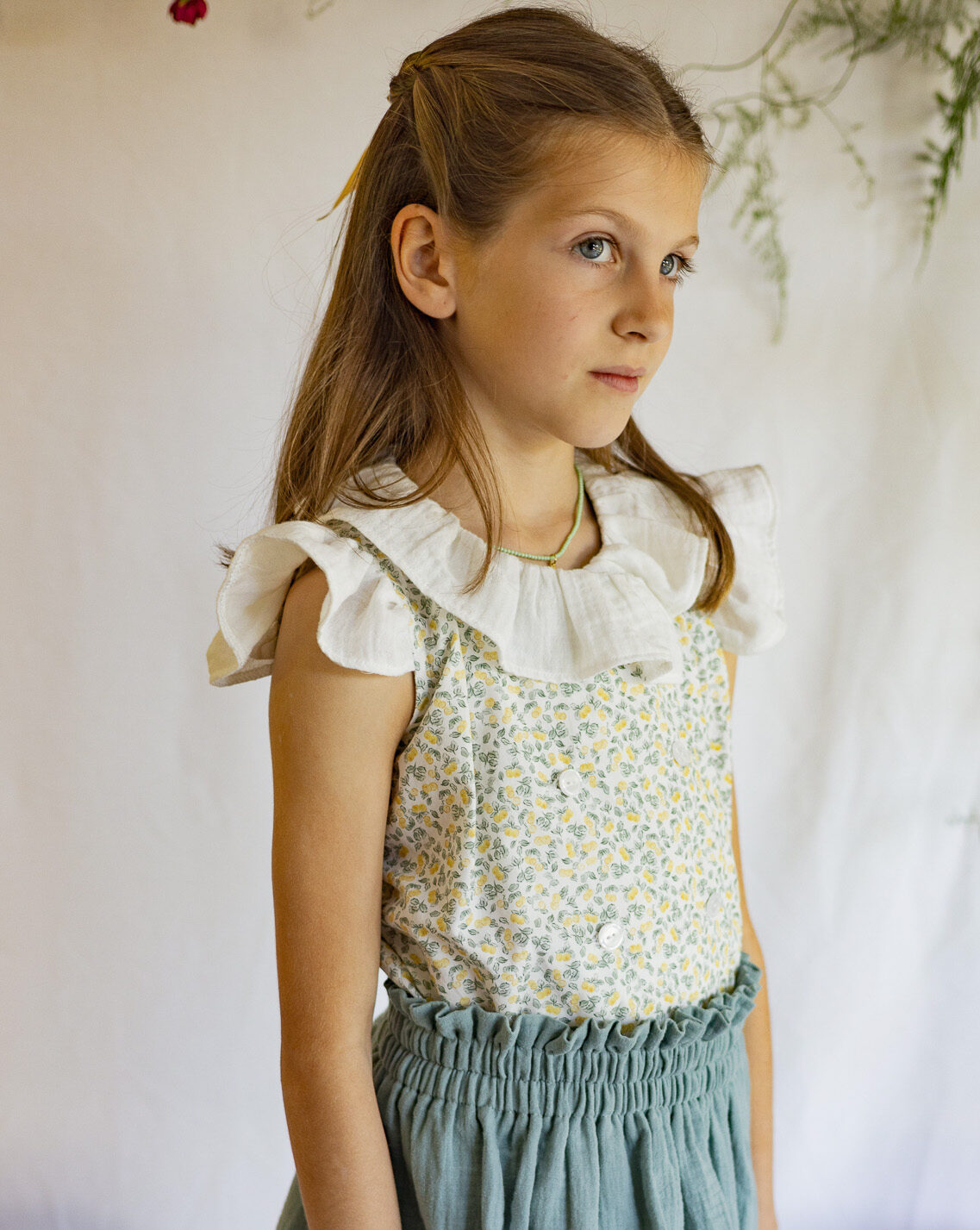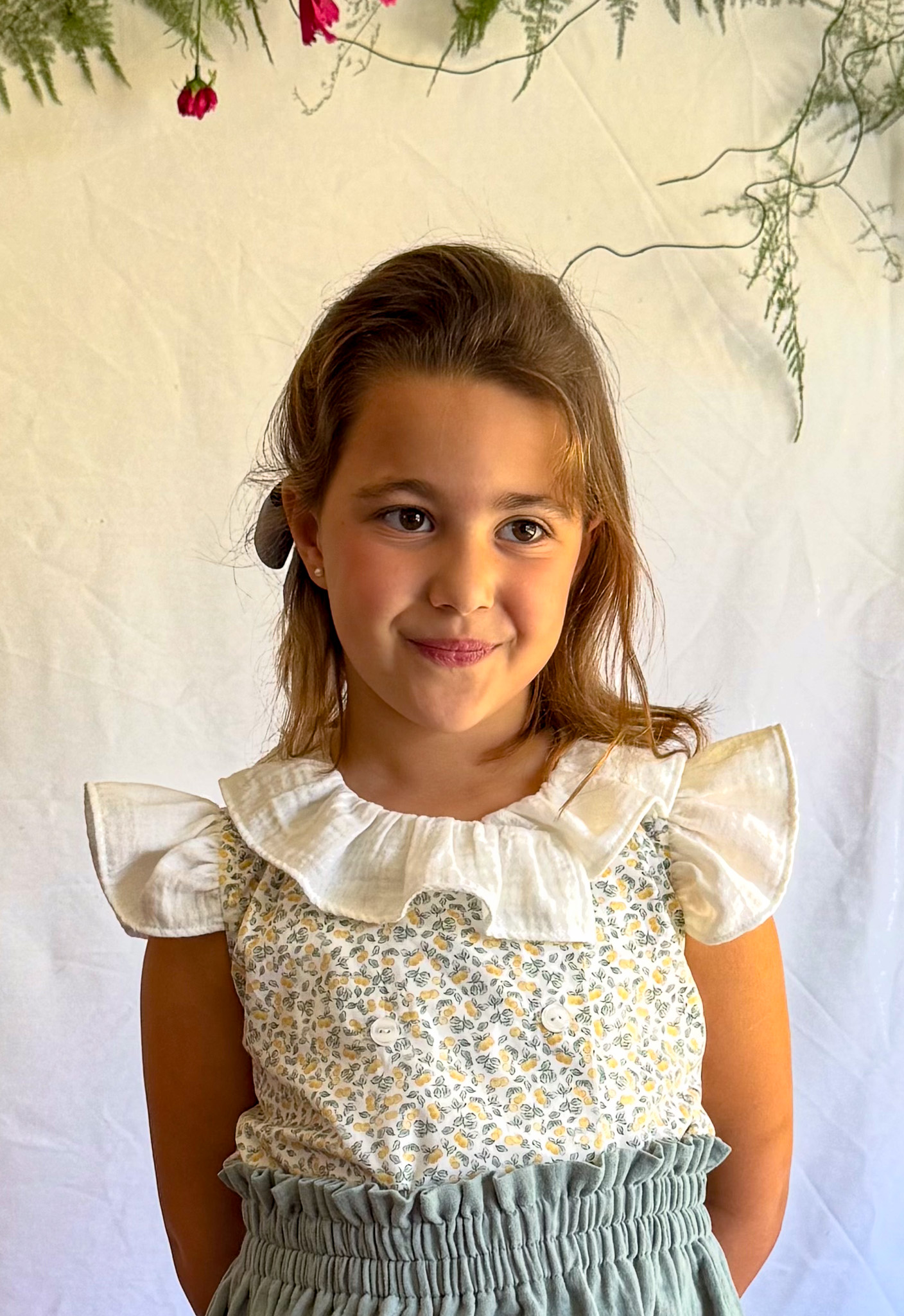 Camisa hecha en tejido de bambula estampada con volante en manga y cuello blanco. 100% algodón.