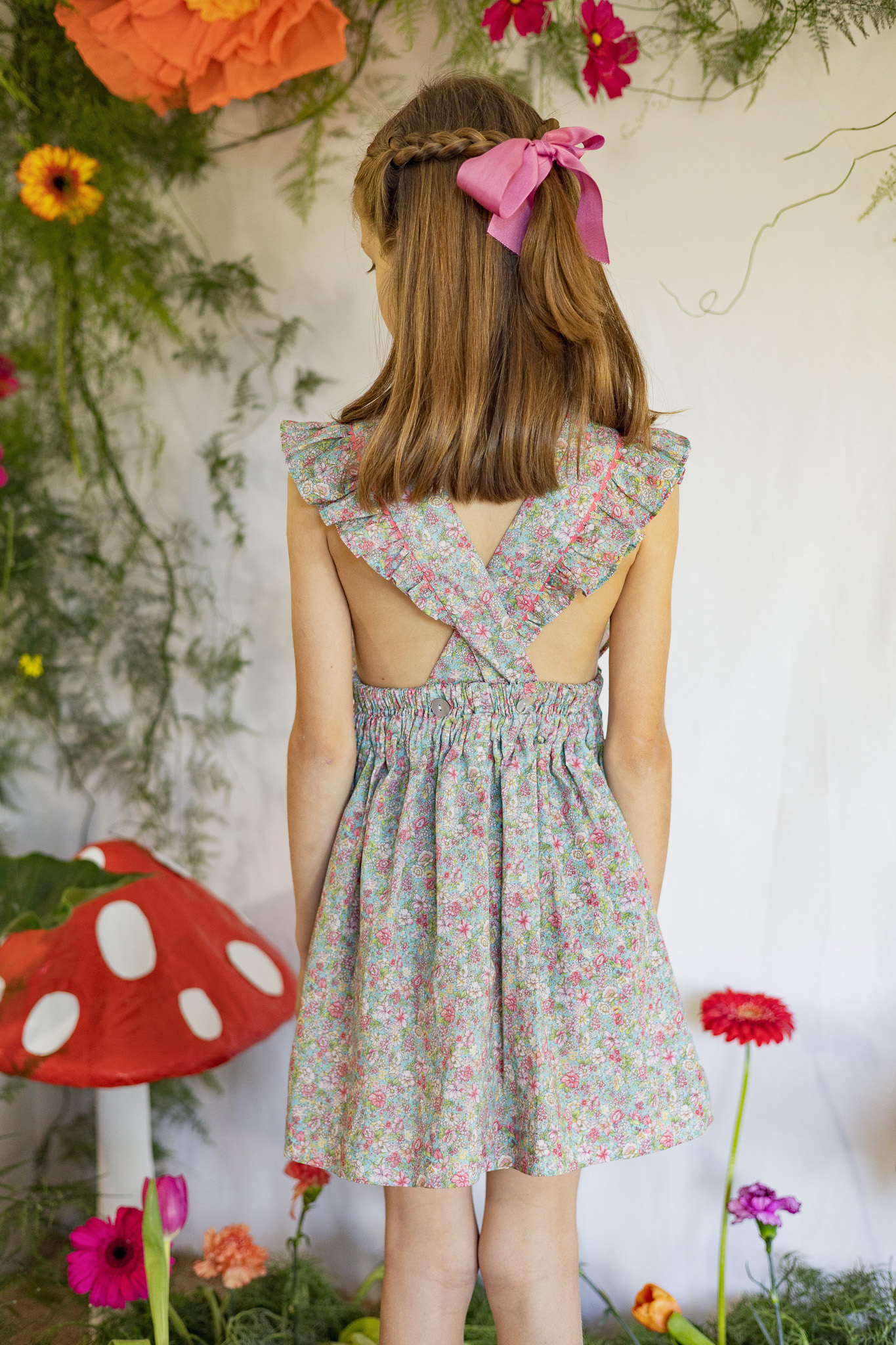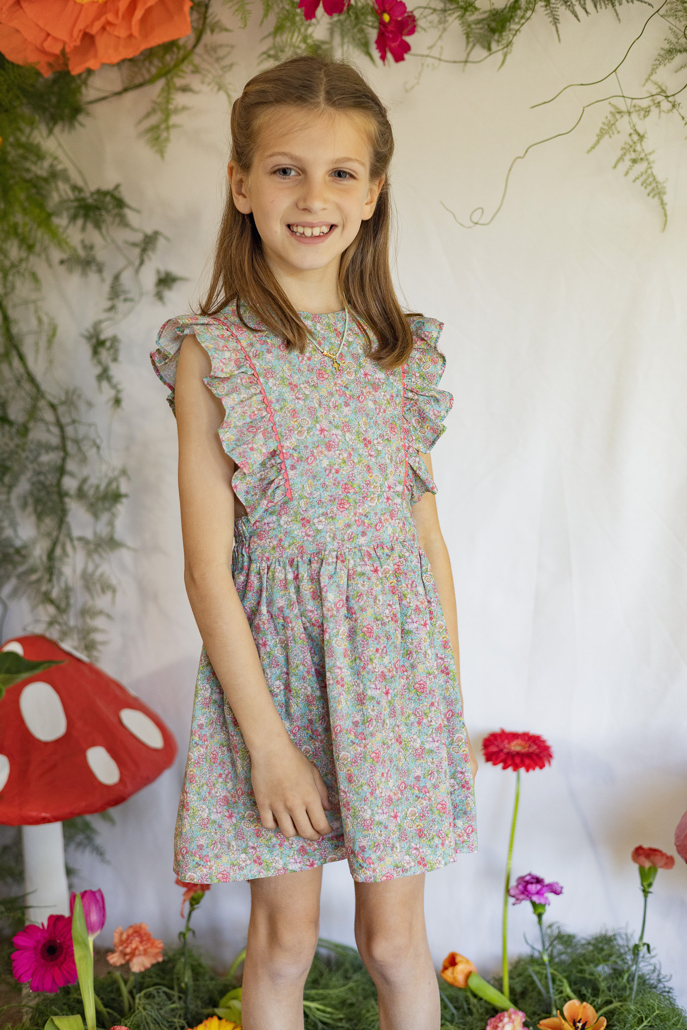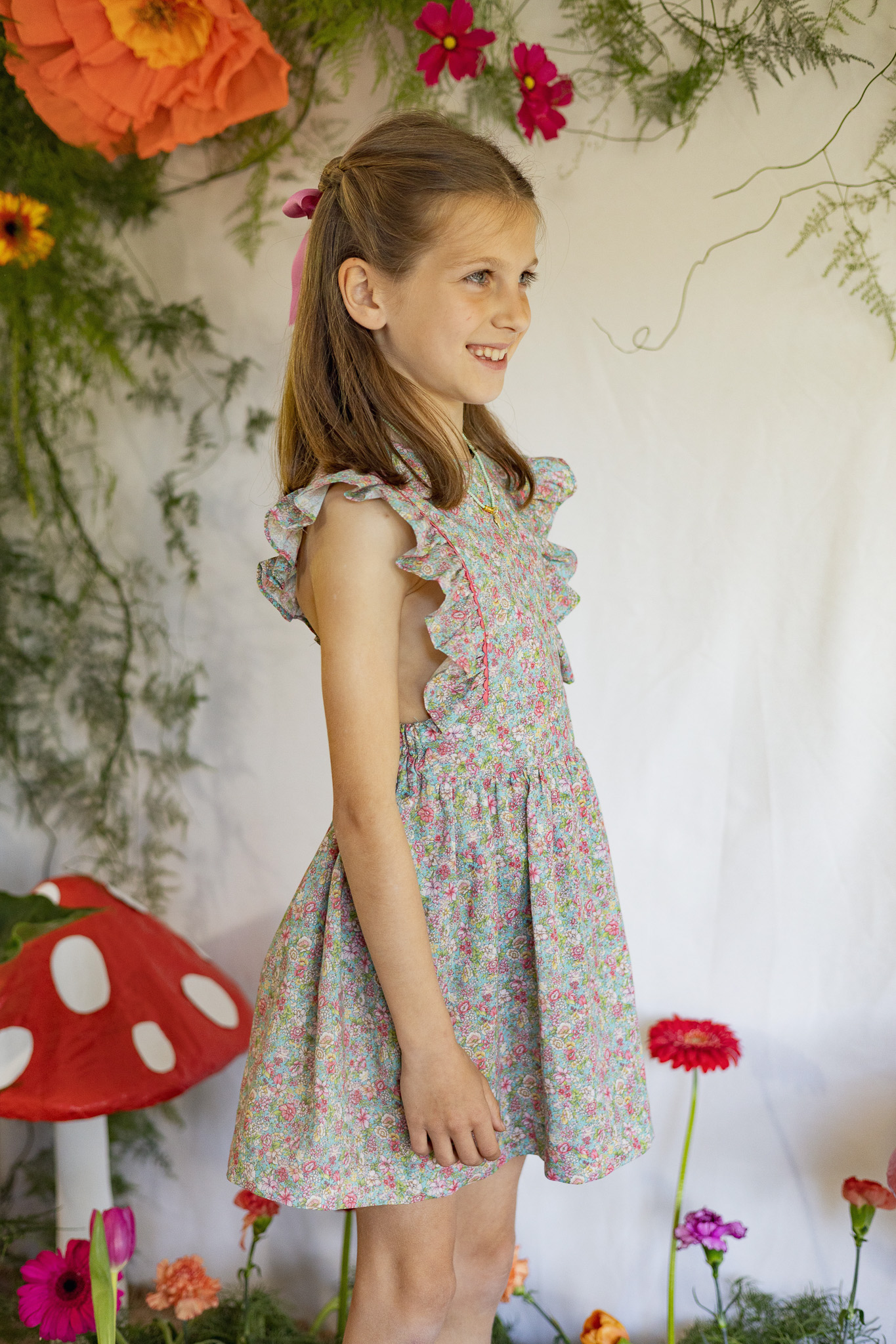 Falda peto hecha con tejido estampado y piquillo fresa. Tejido 100% algodón.