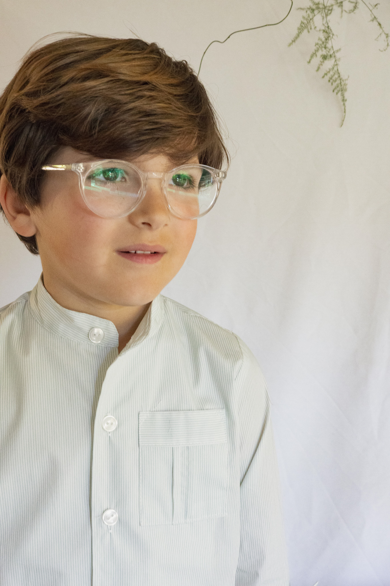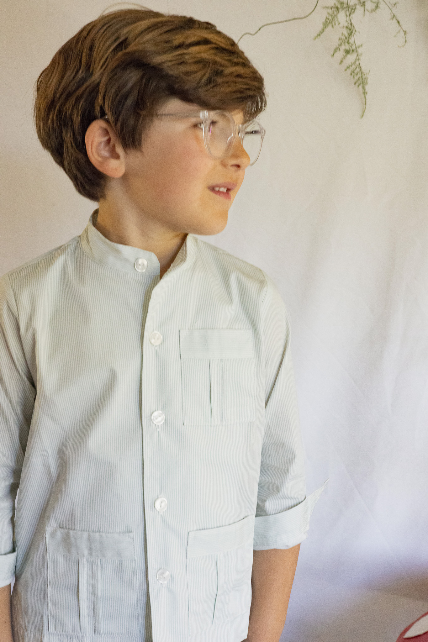 Camisa guayabera hecha con tejido de algodón 100% de 1000 rayas verdes.