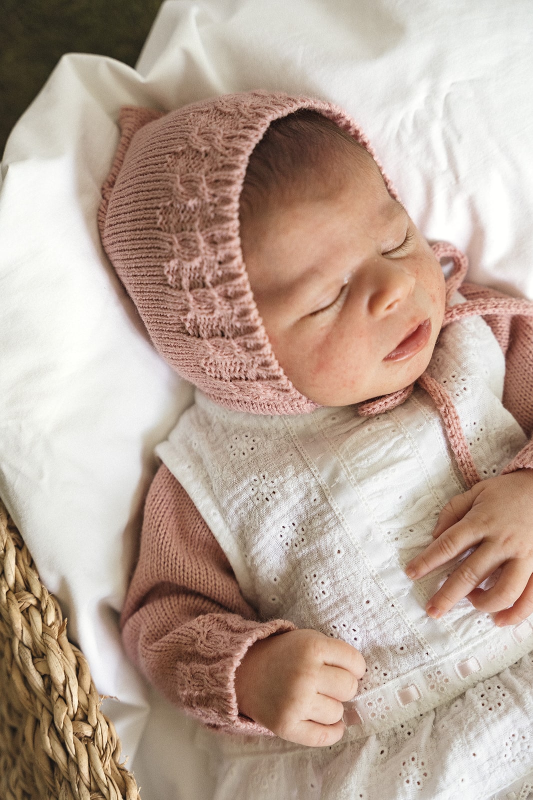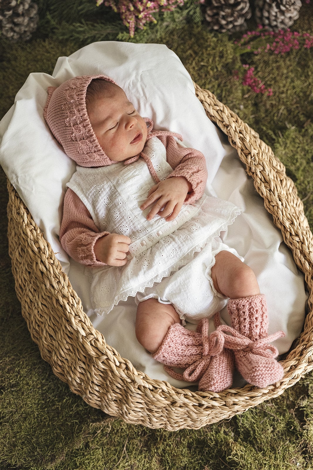 JESUSITO HECHO EN TEJIDO DE ALGODÓN CON CINTA DE COLOR ROSA. DOS PIEZAS.