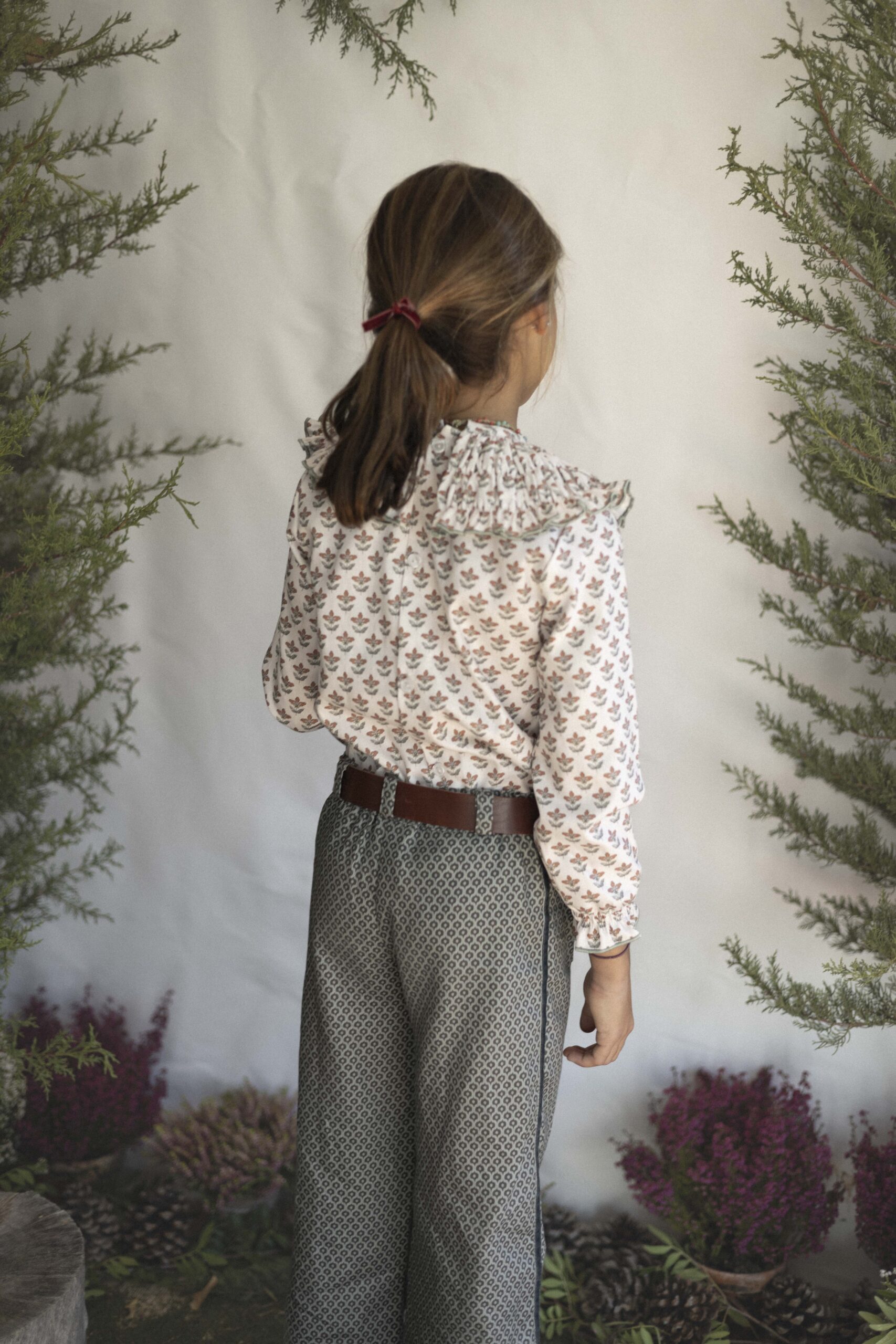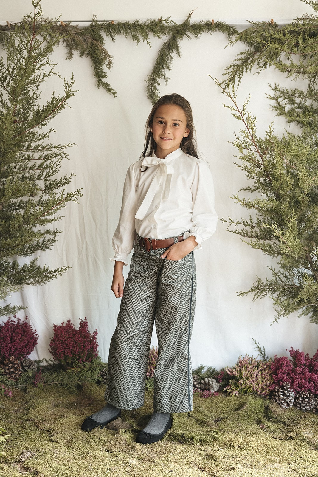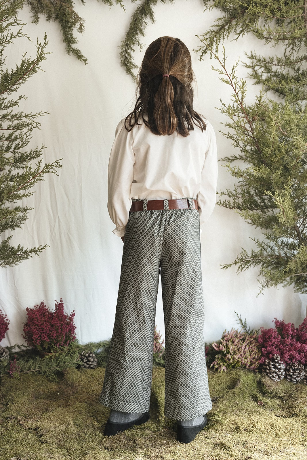 PANTALÓN LARGO HECHO EN TEJIDO DE ALGODÓN ESTAMPADO Y DETALLE TERCIOPELO GRIS VERDOSO.
