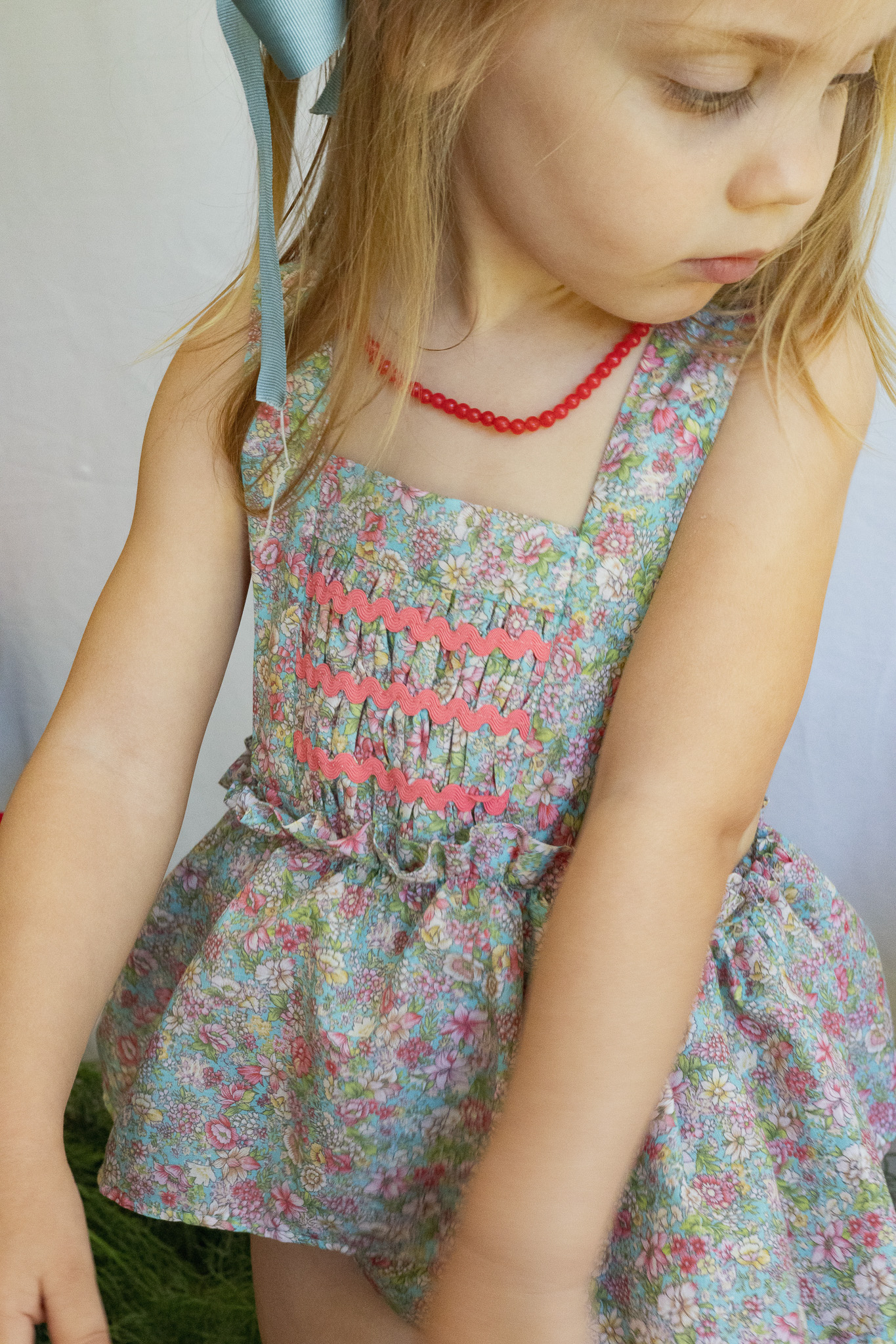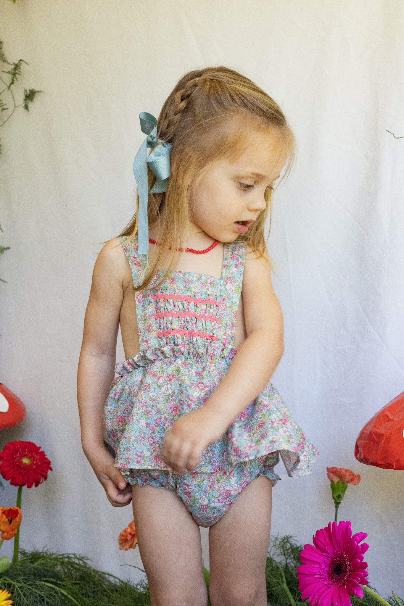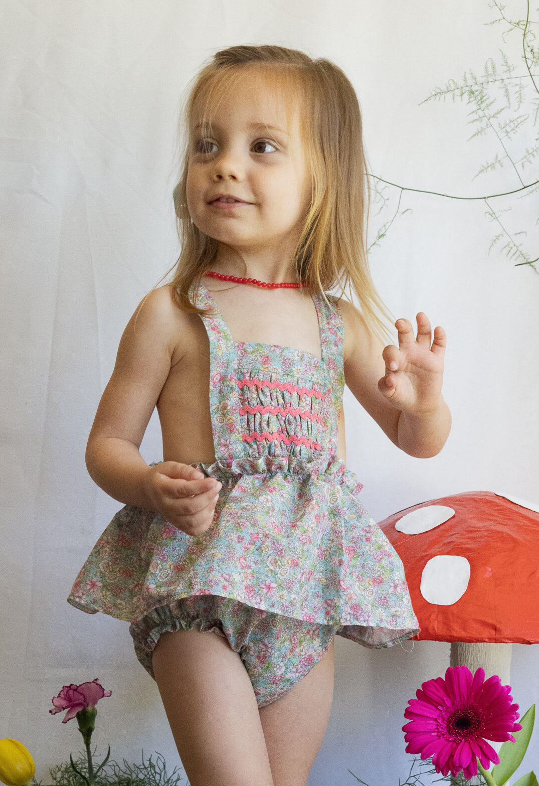 Peto hecho en tejido estampado y piquillo fresa. Tejido 100% algodón.