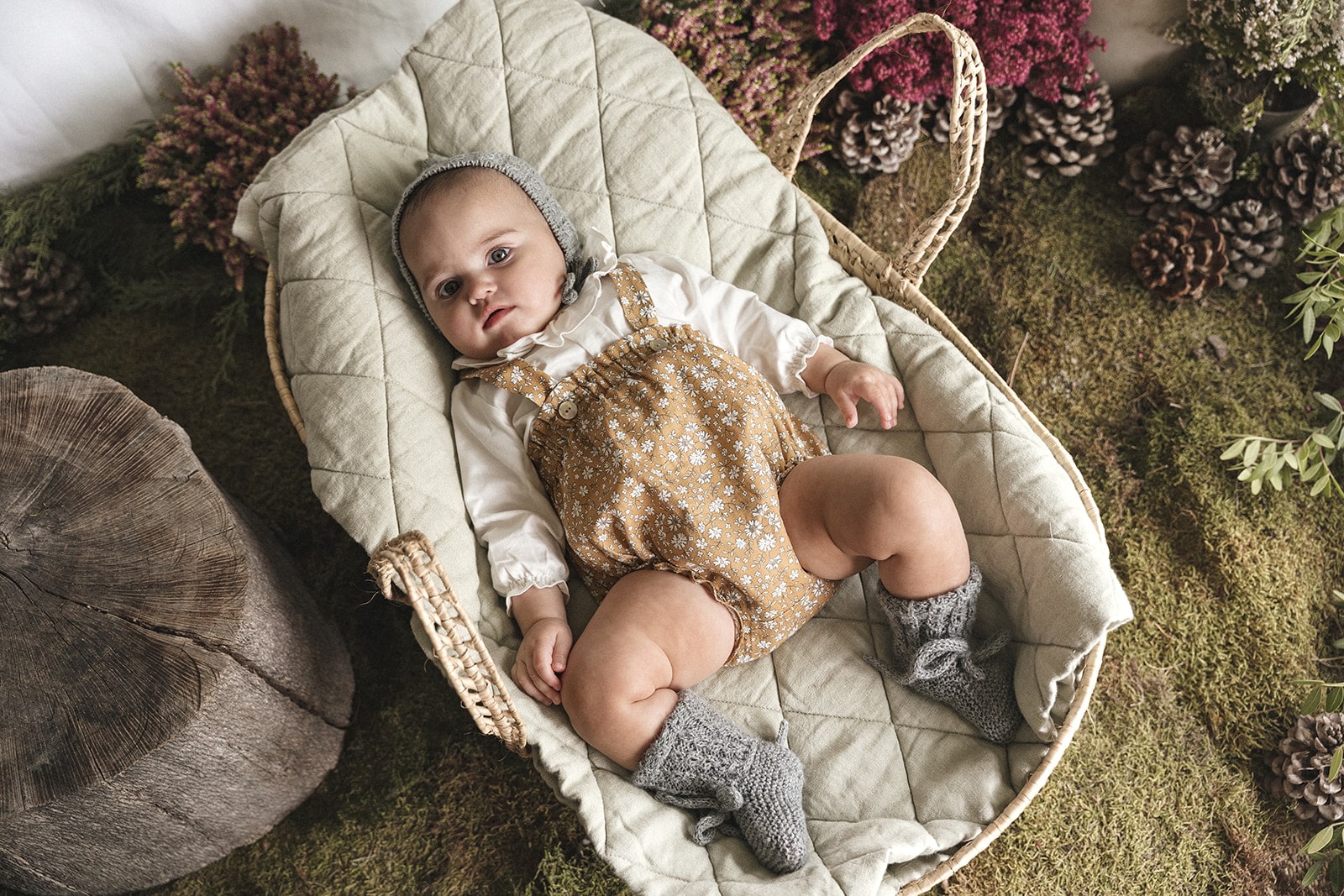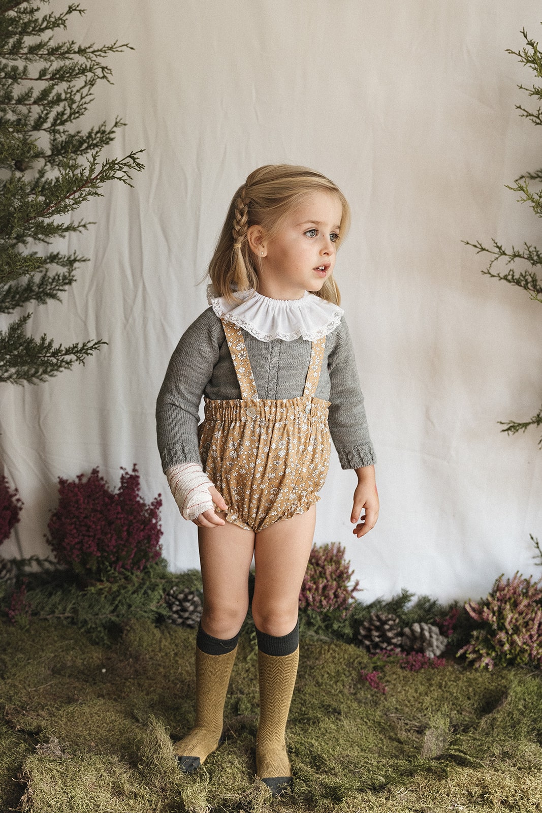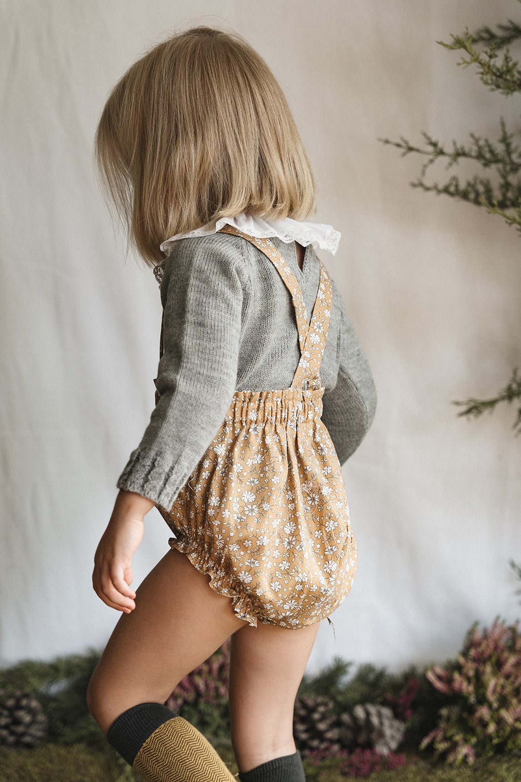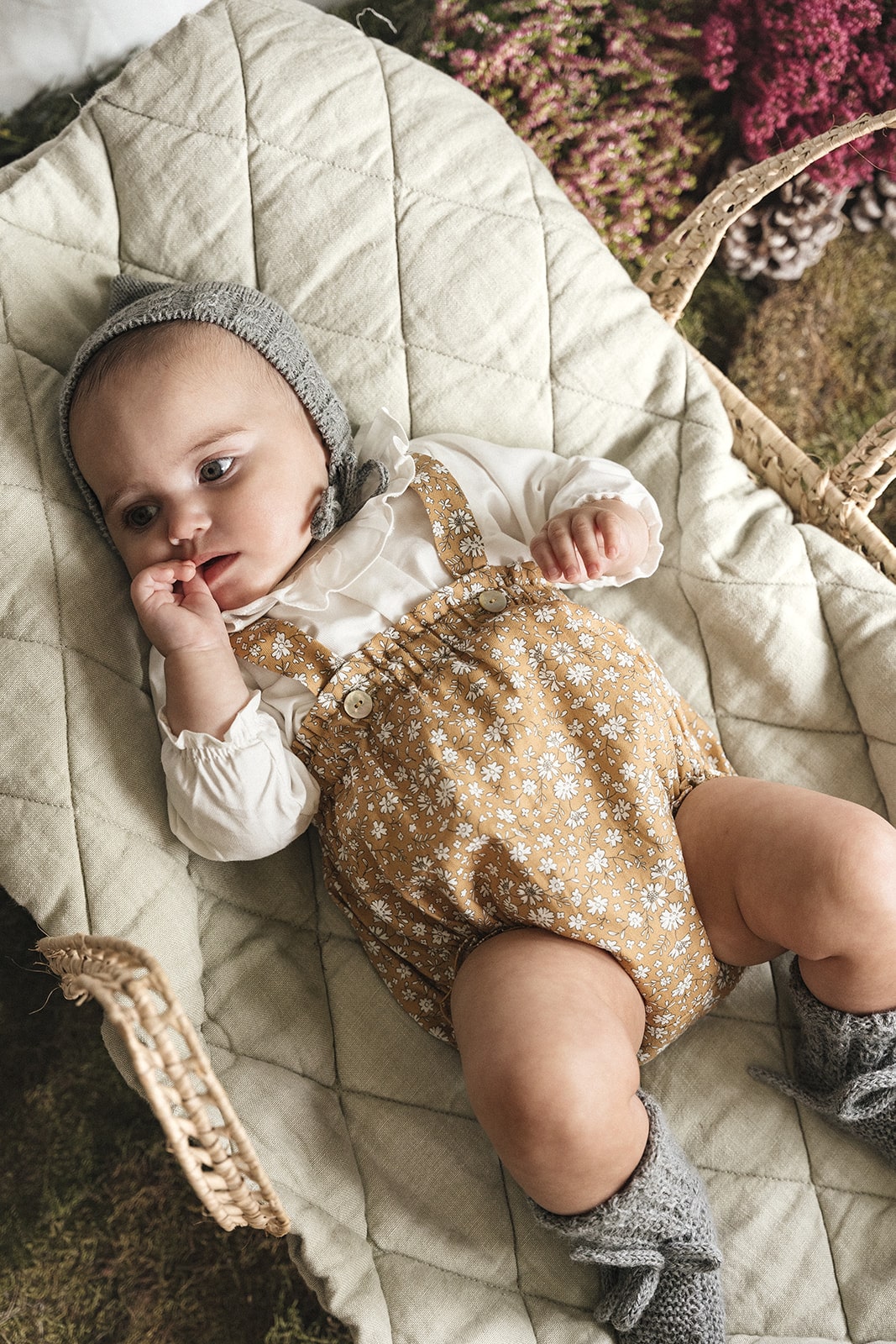PELELE HECHO CON TEJIDO DE ALGODÓN ESTAMPADO CON MOTIVOS FLORALES Y FONDO MOSTAZA. P(0M-4M) M(4M-7M) G(7M-12M).
