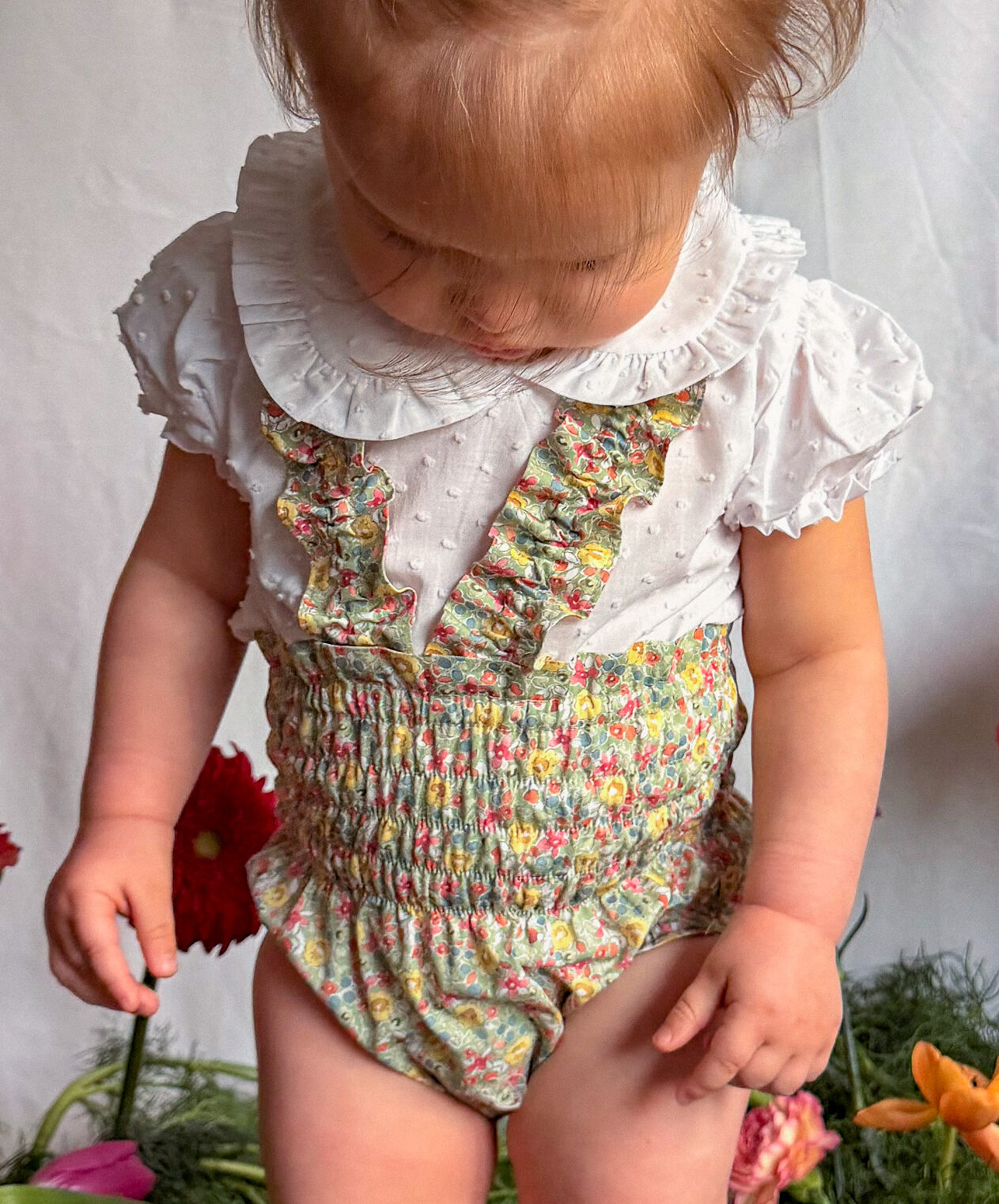 RANITA BAÑADOR engomado con estampado flores. 100% algodón.P(2m hasta 6m) M(6m-10m) G(10m-18m).